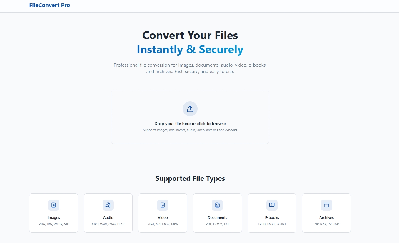 Universal file converter supporting audio, image, video, document, e-book, and archive formats